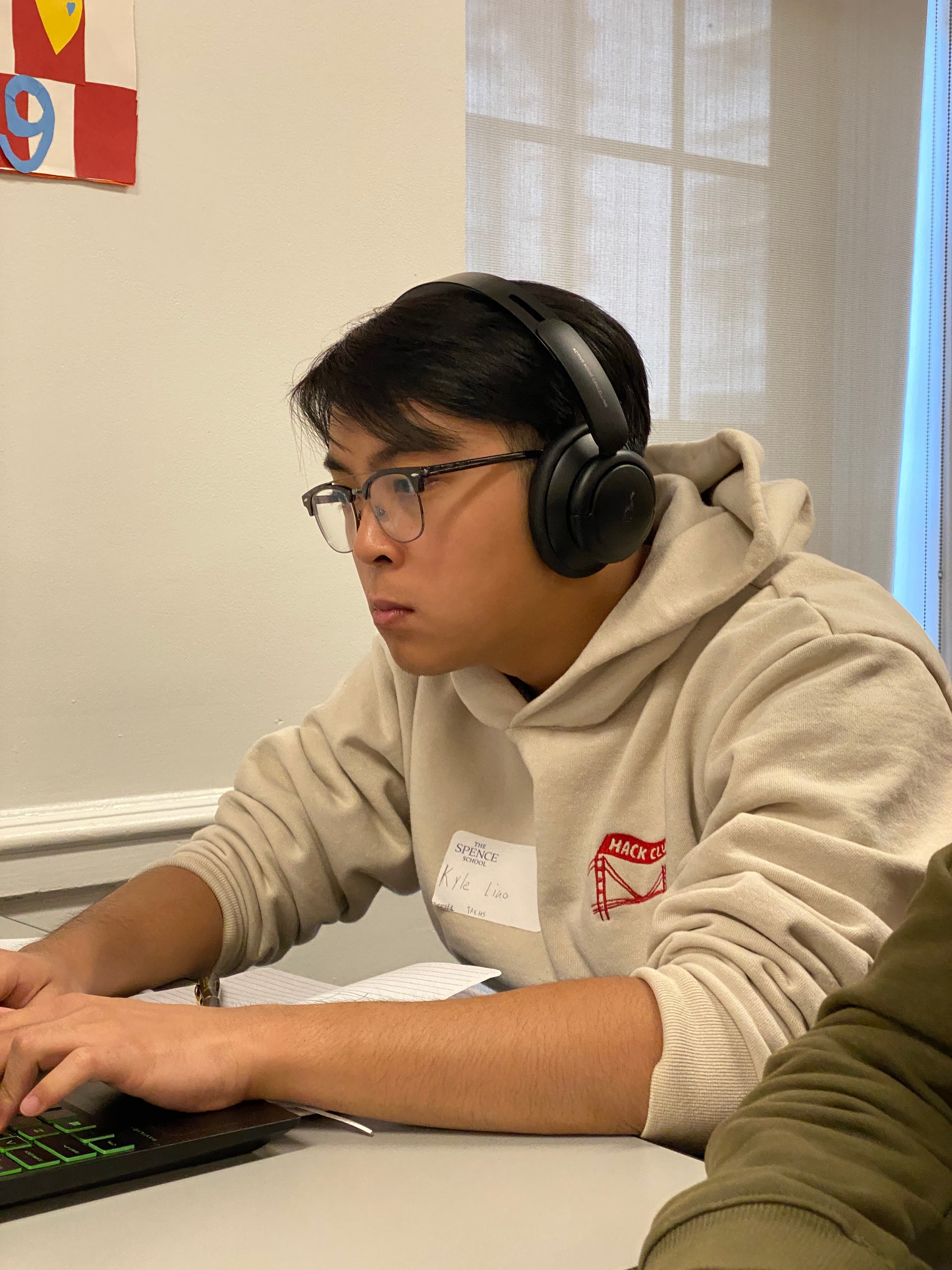 - Wearing free tech merch, running shoes, and a black backpack.